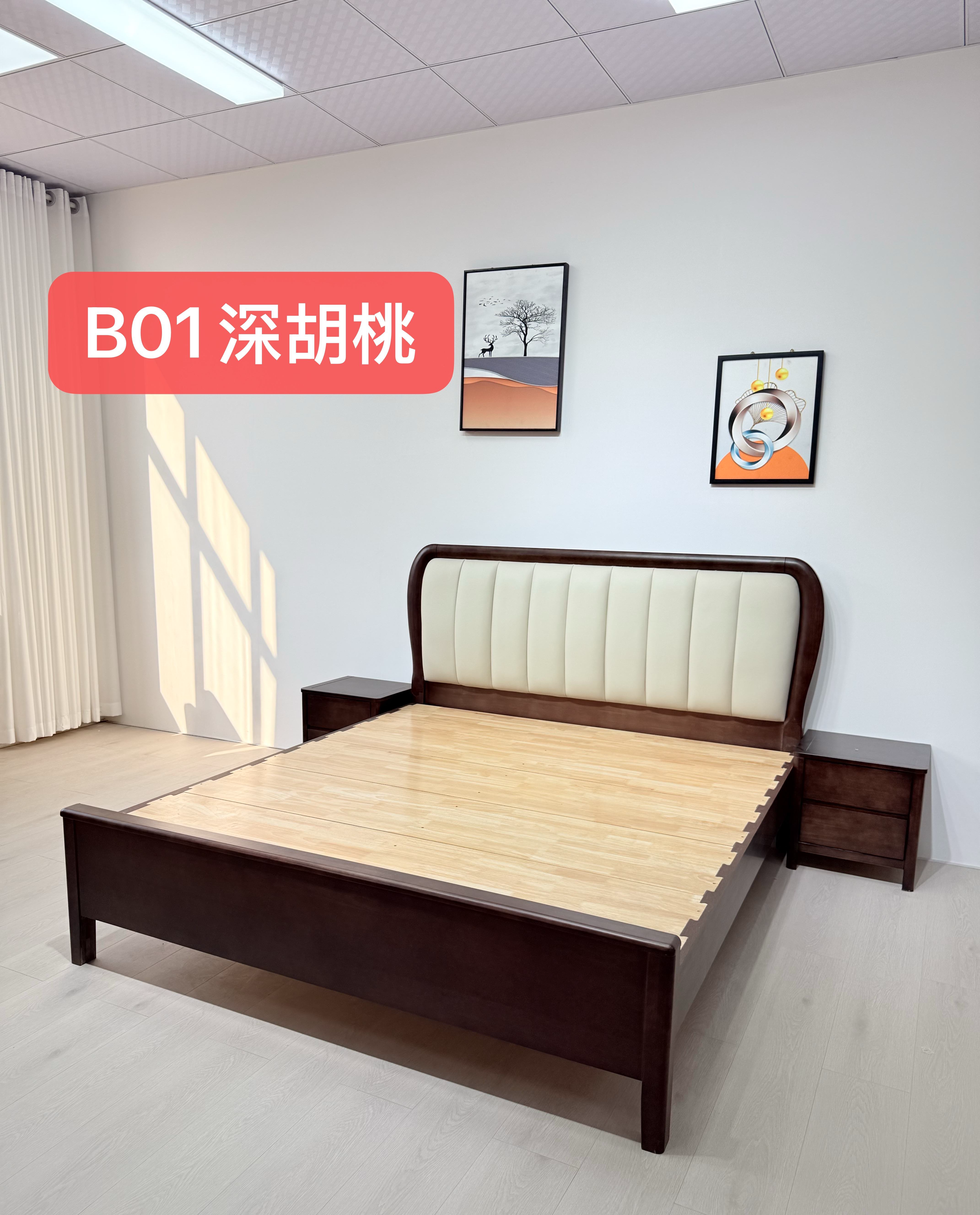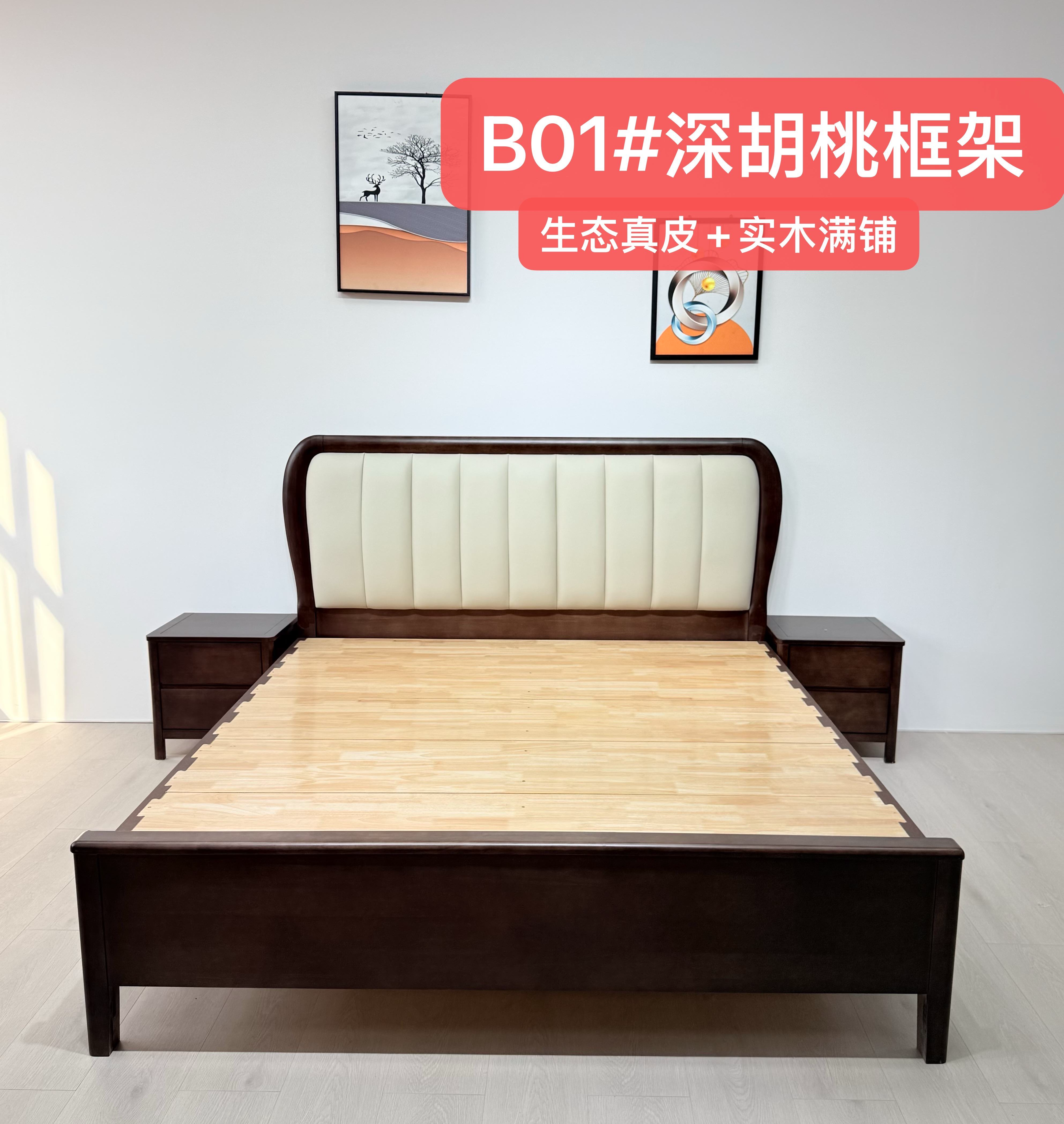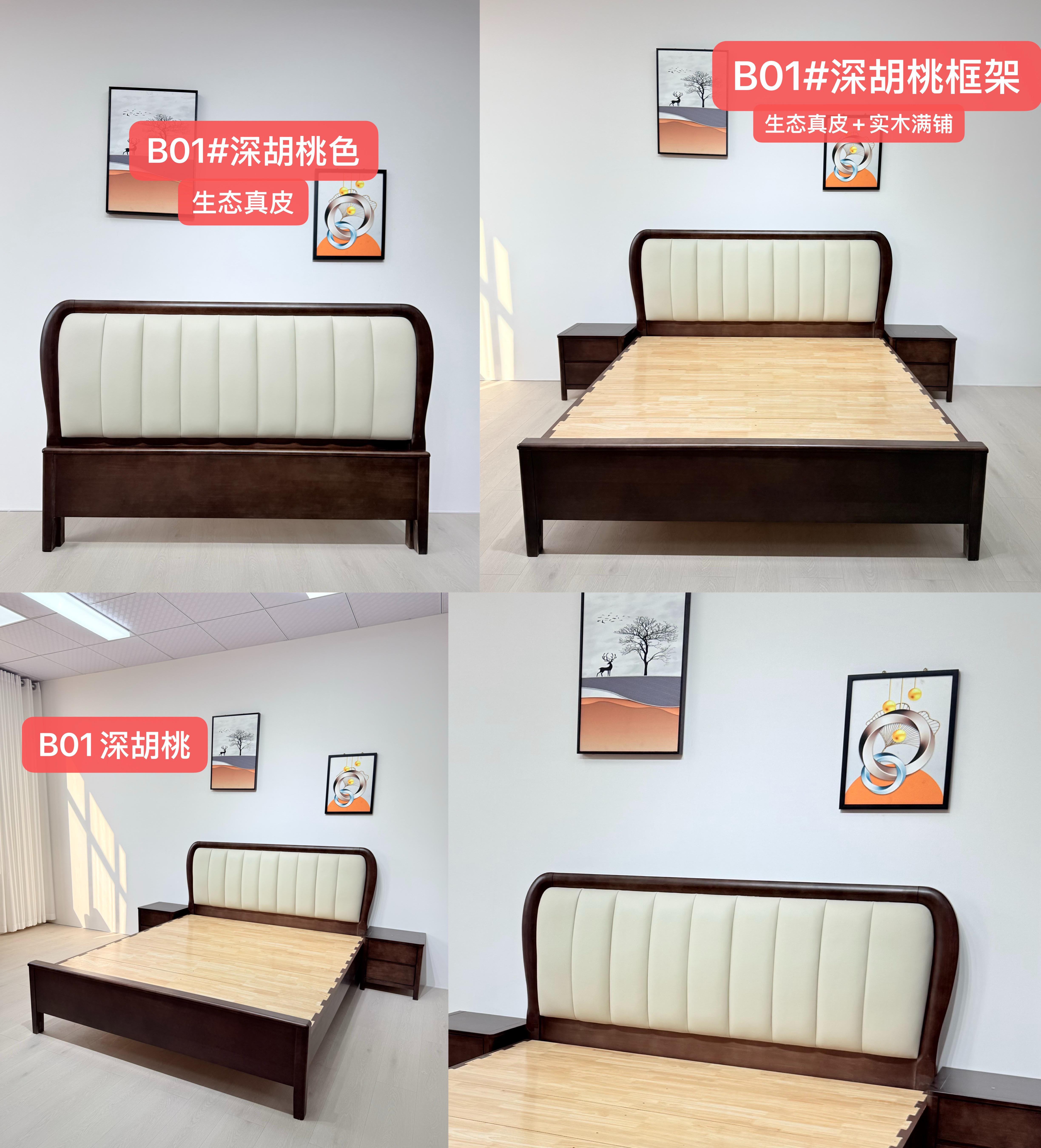 橡胶木框架+生态真皮 标配:月牙配色床边 3*6床子7根 配置2:实木满铺床板