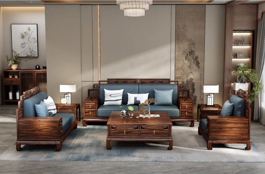 乌金木 单人位:1420*860*1100mm 双人位:1970*860*1100mm 三人位:2620*860*1100mm 大方几:1216*1216*496mm 小茶几:700*700*603mm