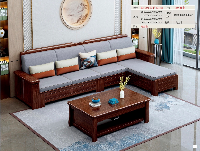 乌金木,2016#(扶手17cm)规格:3500X800X1850mm 3300X800X1850mm 3100X800X1850mm 2900X800X1850mm长茶几:1450X800X480mm