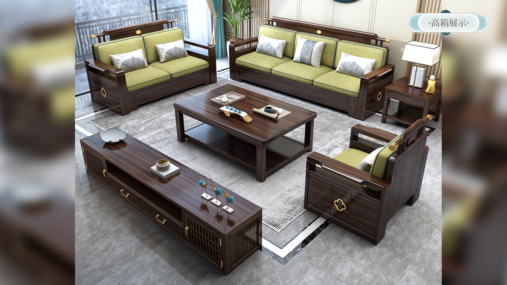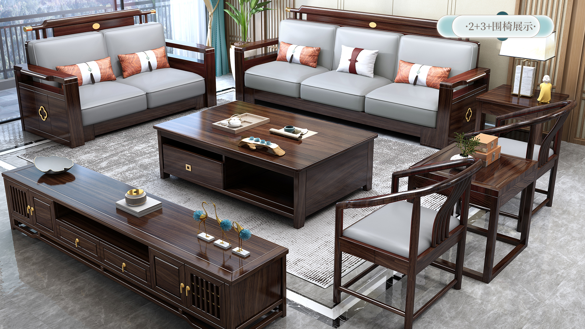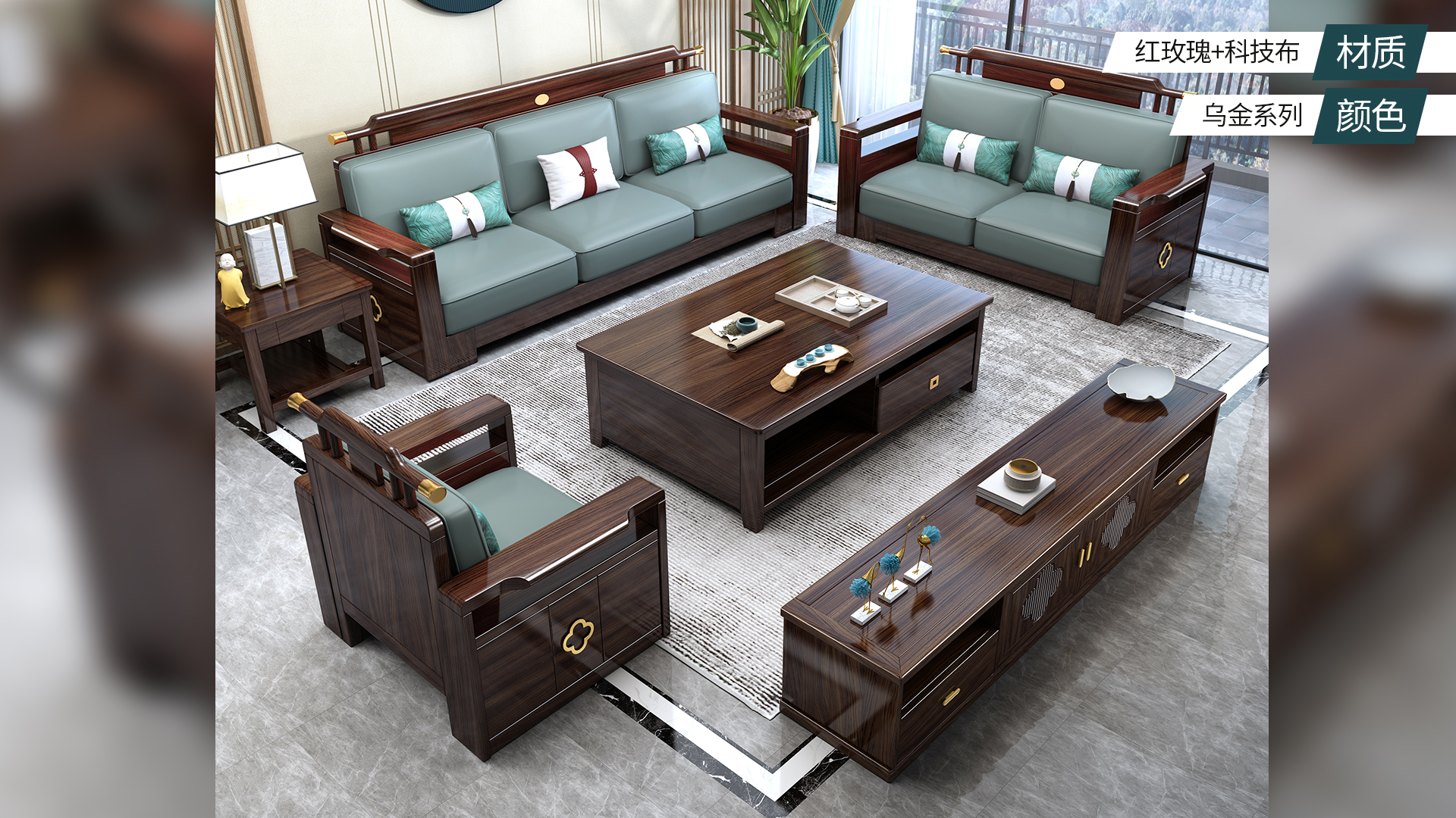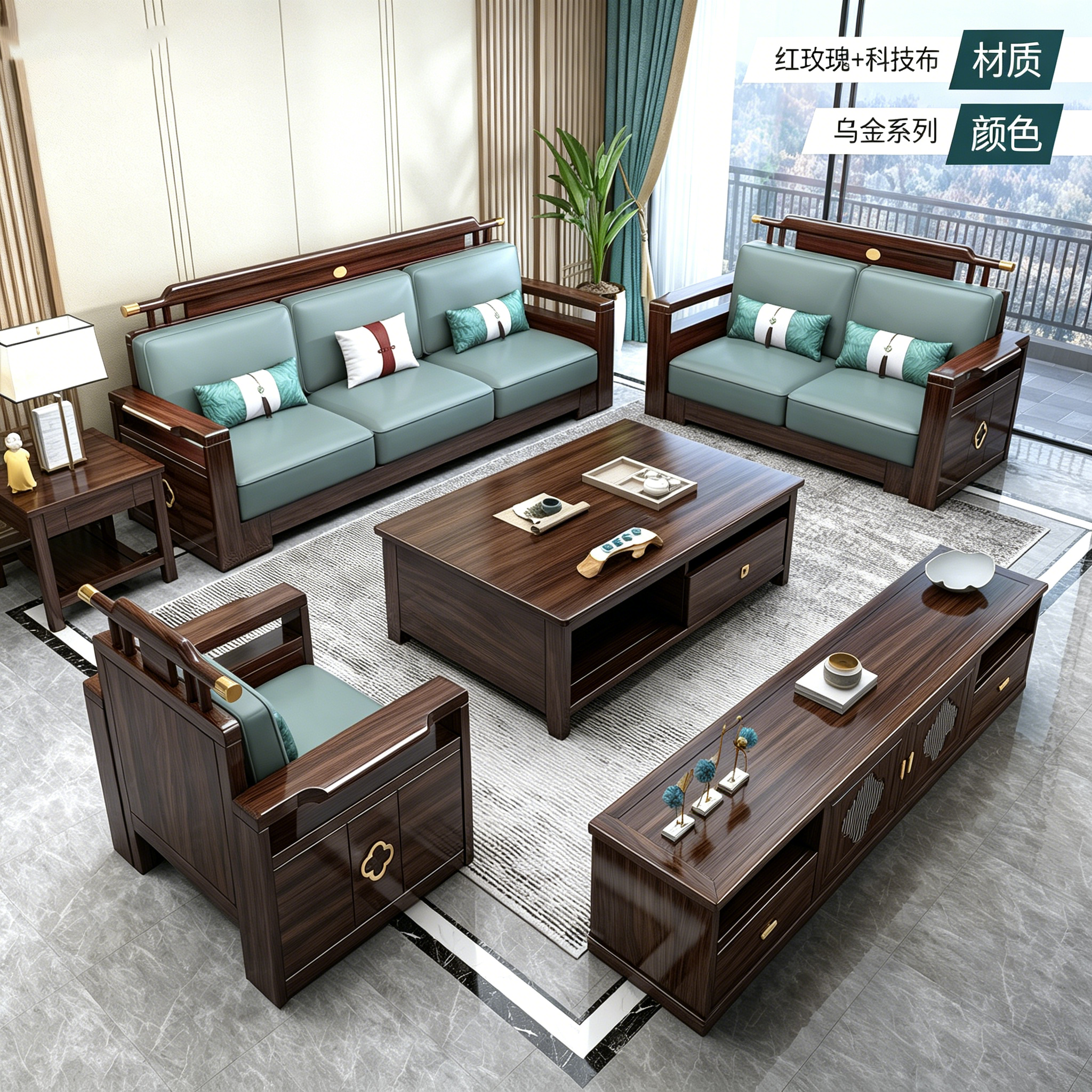 连乔-新中式乌金色客厅沙发套系