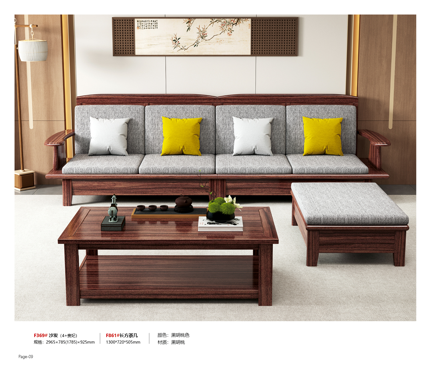 型号;华夏百沐-F369# 黑胡桃低箱沙发规格;四人位 3100*800*950./贵妃 1000*650*400/F366#长茶几 1400*800*480/四人位贵妃+长茶 几