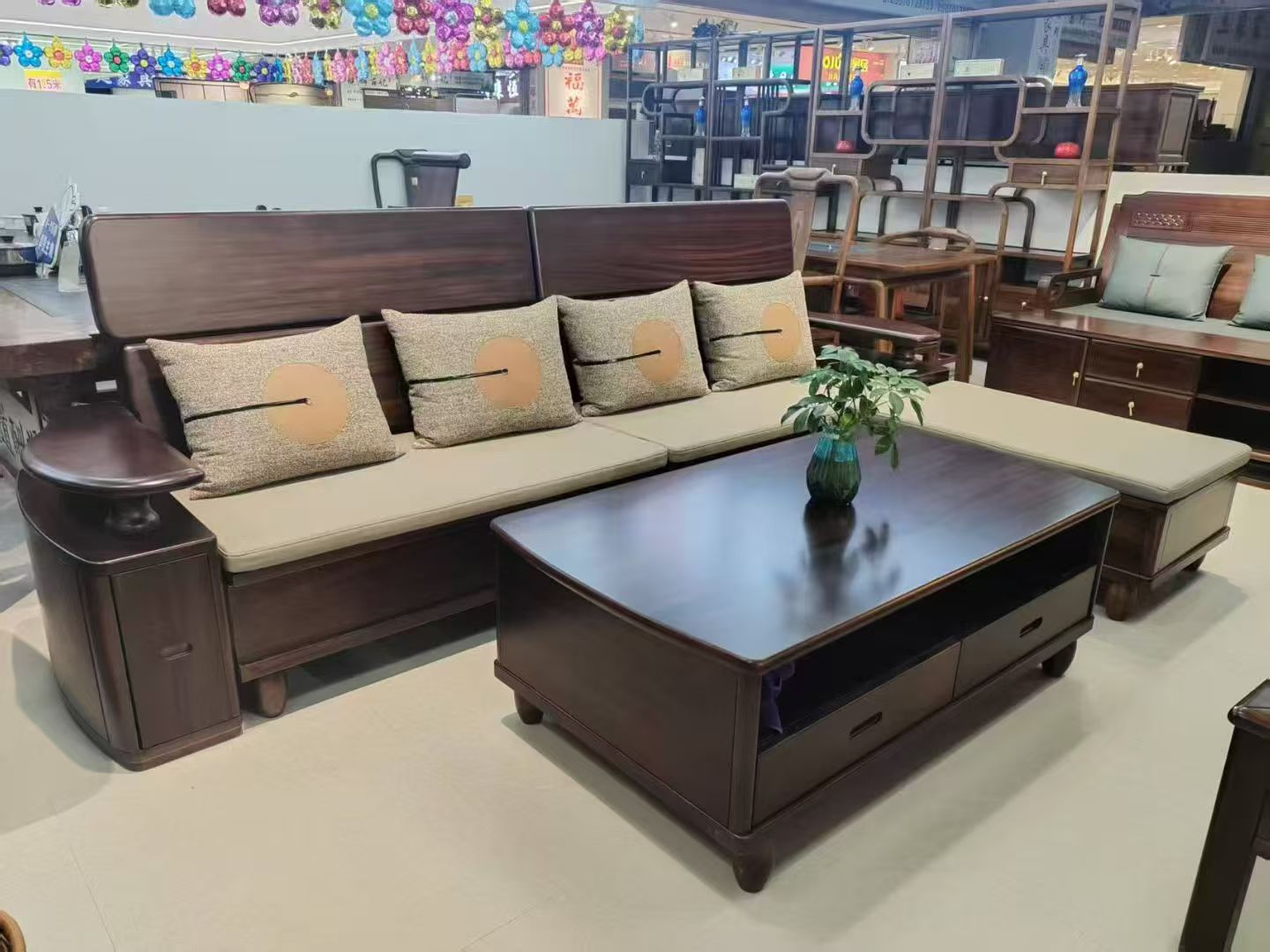 黑胡桃木 带三个高箱扶手实心实木28公分,扶手带两个抽屉靠背6公分厚实心木板,坐板整块实木实心板,沙发茶几带葫芦脚,带一个12茶几带贵妃