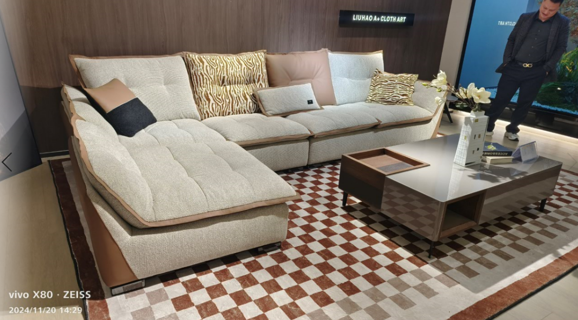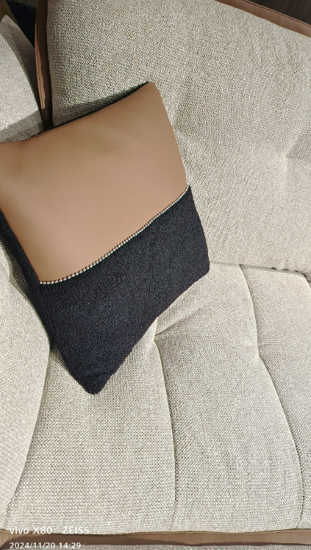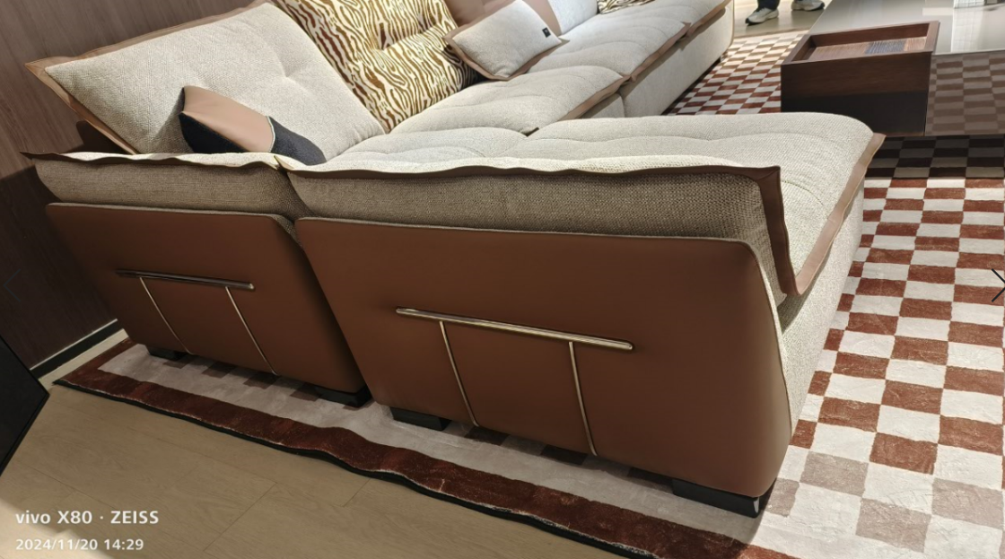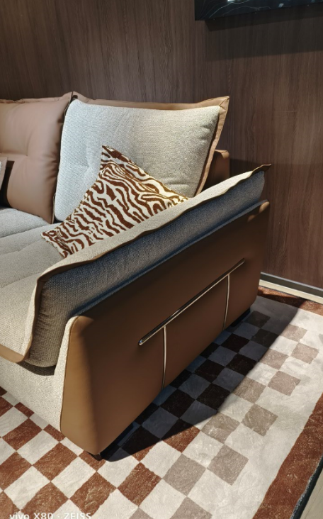 高端彩麻配生态皮面料,扶手两侧不锈钢配件